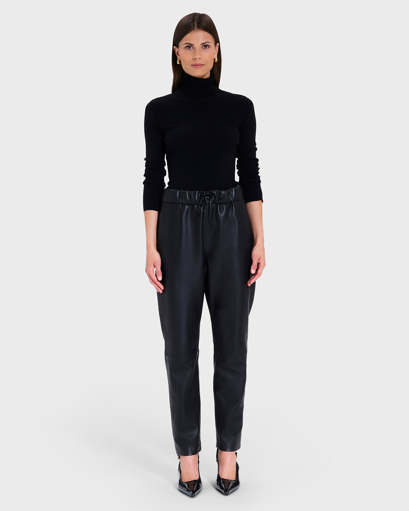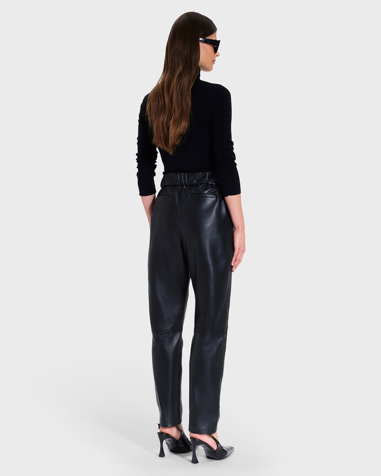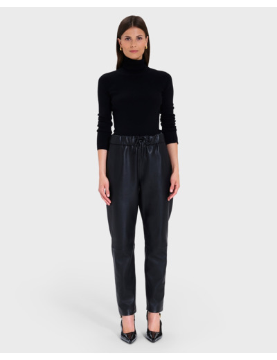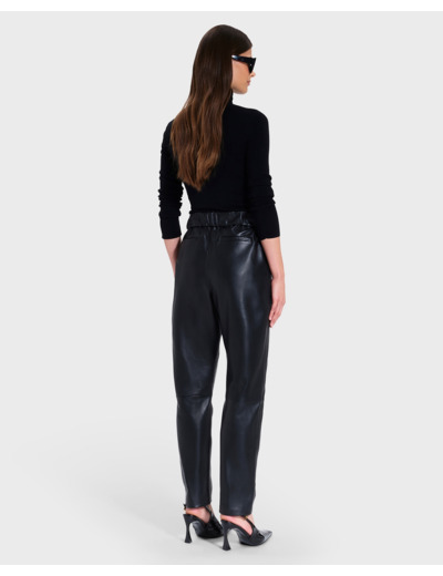 Confectionné en cuir souple, ce pantalon se distingue par sa fluidité et sa finition impeccable. Les poches raglans apportent une touche fonctionnelle sans compromettre l’esthétique épurée. Portez-le avec un pull noir pour un total look monochrome ou associez-le à des pièces colorées pour dynamiser votre tenue.