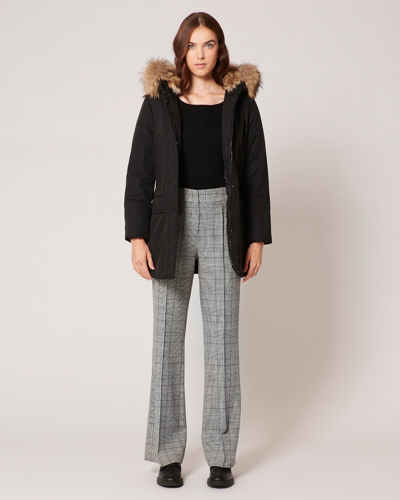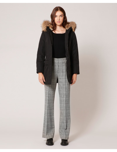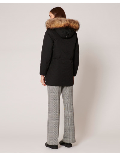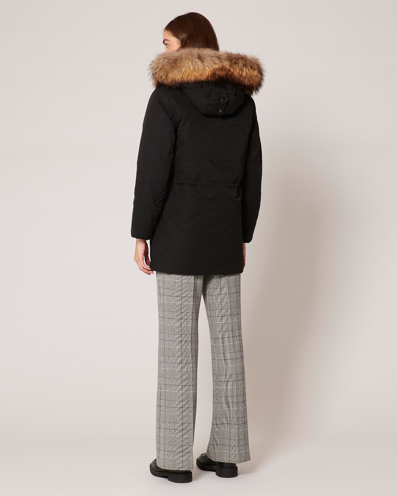 Composition : 62 % coton, 38 % polyamide, fourrure de tanuki véritable amovible. Entretien : nettoyage à sec uniquement, repassage doux à 110°C, interdit de lavage, blanchissage et séchage en machine. Longueur : 82 cm. Coloris : noir. Fermeture par zip sous patte pressionnée, poignets en bords-côte, grandes poches à rabat pressionné.