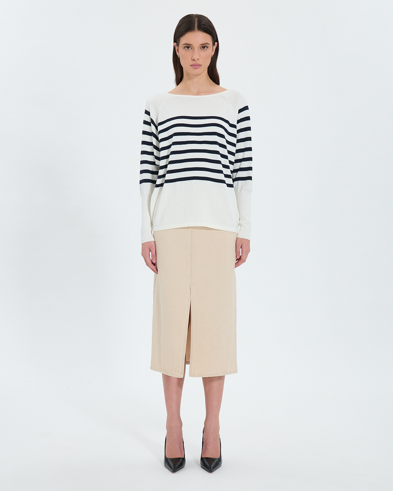 Confectionné dans un mélange de laine mercerisée et fibres synthétiques, ce pull marinière allie douceur et tenue. Le jeu de côtes sur les manches apporte une subtile texture, tandis que la coupe ample garantit un confort optimal sans sacrifier la silhouette. Facile à porter, il s’accorde aussi bien avec un jean qu’une jupe pour un look casual chic.