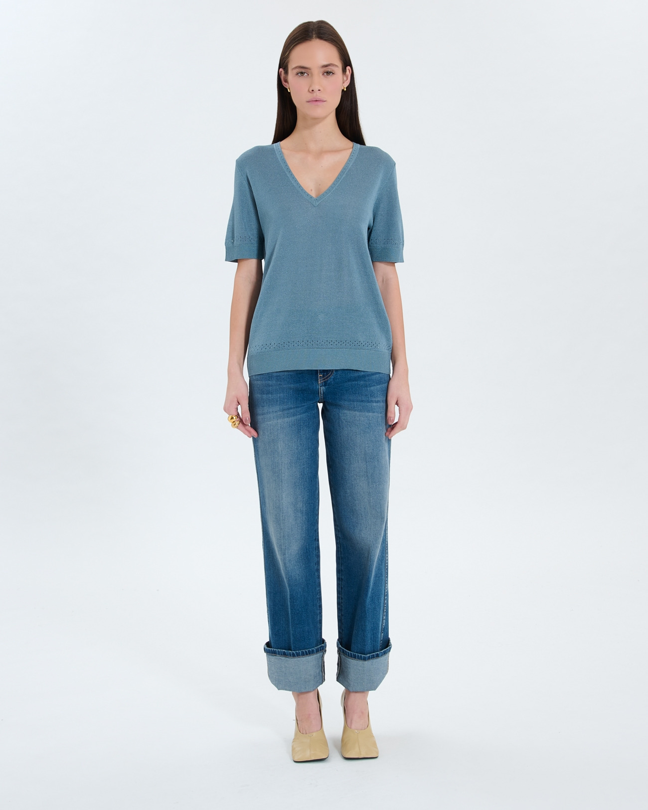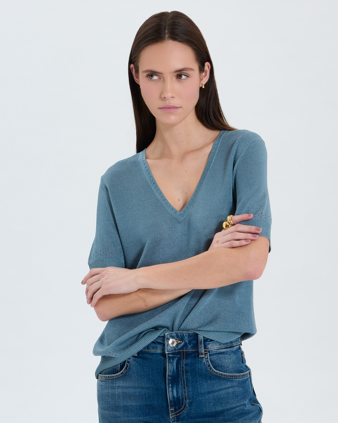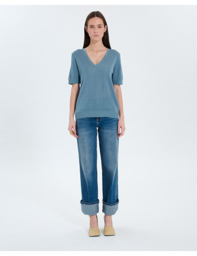 Sublimez votre allure avec ce pull col V bleu hortensia, alliant finesse et modernité. Une pièce légère qui apporte élégance et confort à votre quotidien.