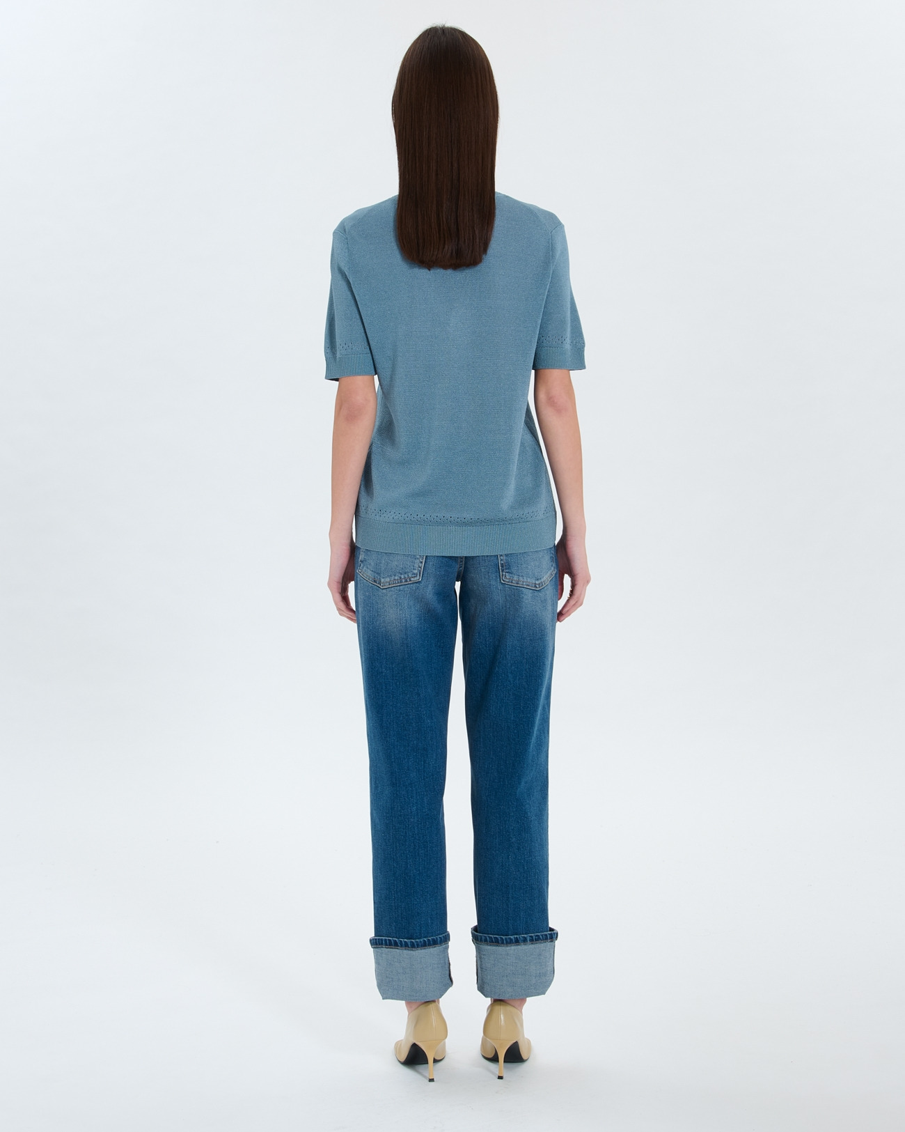 Confectionné dans une maille fine, ce pull droit met en valeur un décolleté délicat et des manches mi-longues agrémentées d’un subtil jeu de mailles. Sa teinte bleu hortensia apporte une touche de fraîcheur et de douceur à toutes vos tenues, du bureau aux sorties décontractées.