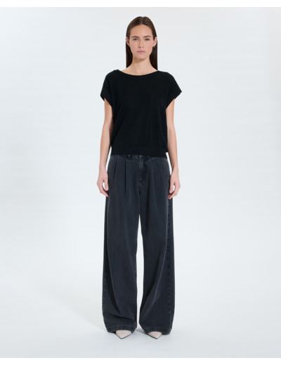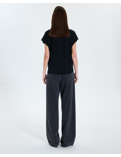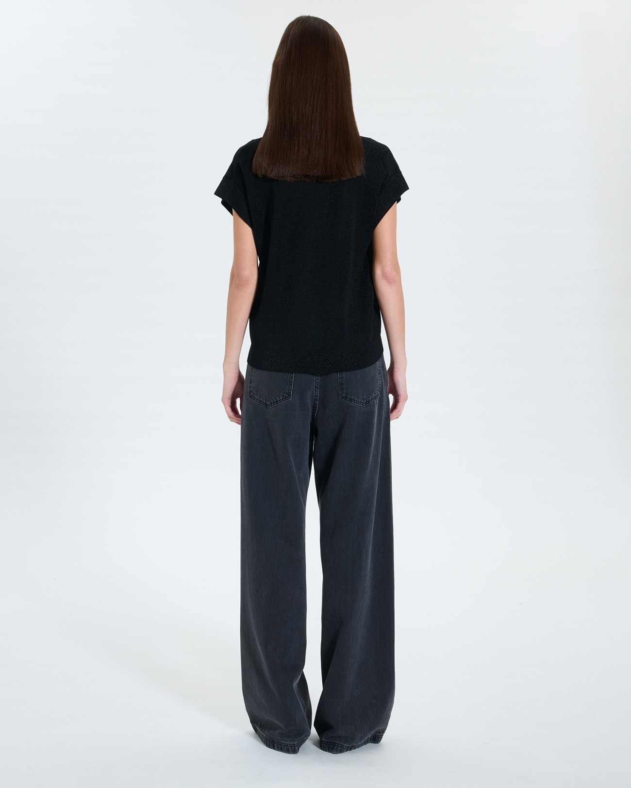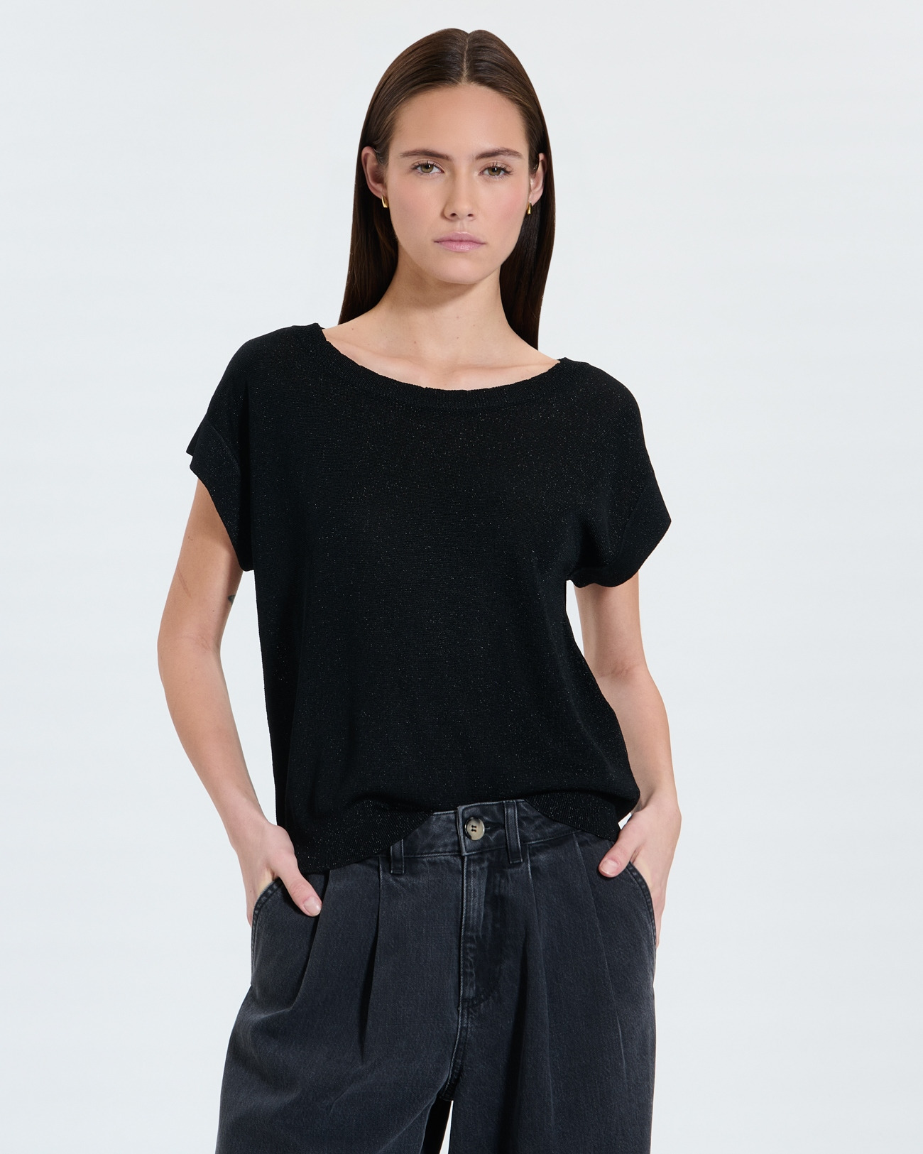 Confectionné dans une matière fluide et légère, ce pull offre une coupe droite moderne et des manches courtes évasées qui apportent une touche d’originalité. Son col rond classique met en valeur la finesse du design, tandis que le coloris noir lurex ajoute une brillance discrète et sophistiquée. Parfait pour une soirée ou un jour où vous souhaitez briller sans effort, il se marie idéalement avec le pull Gypsine assorti pour un ensemble harmonieux.