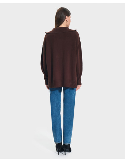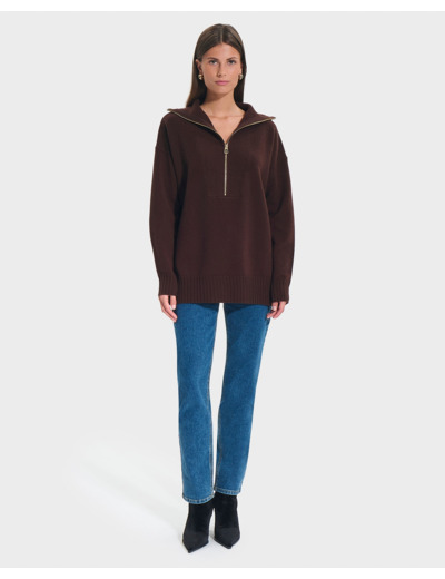 Composition : 100% laine mérinos. Entretien : lavage à la main recommandé, pas de blanchiment, séchage à plat, repassage maximum 110°C, nettoyage à sec possible. Pull ample mi-long avec col camionneur à zip, manches longues et finitions côtelées. Coloris chocolat.