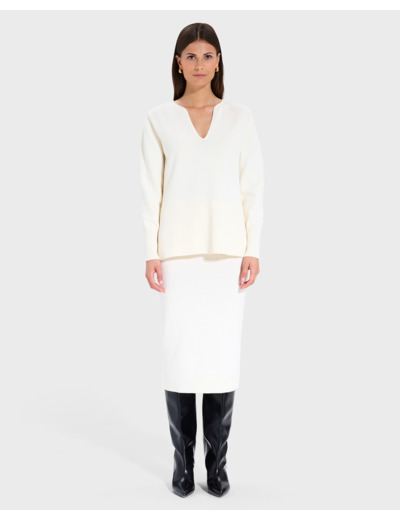 Conçu pour sublimer sans effort, ce pull à col V se distingue par ses manches bracelet qui ajoutent une finition soignée. Porté avec la jupe Jelico, il crée un duo harmonieux, parfait pour vos journées au bureau ou vos sorties en ville. Sa couleur écru éclaire subtilement vos looks tout en restant facile à associer.