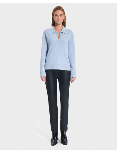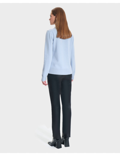 Fabriqué en 100 % laine mérinos, ce modèle nécessite un entretien délicat : lavage à la main, pas de blanchiment, séchage à plat, repassage maximum à 110°C et nettoyage à sec possible. Les manches longues et le coloris bleu ciel complètent ce basique haut de gamme.