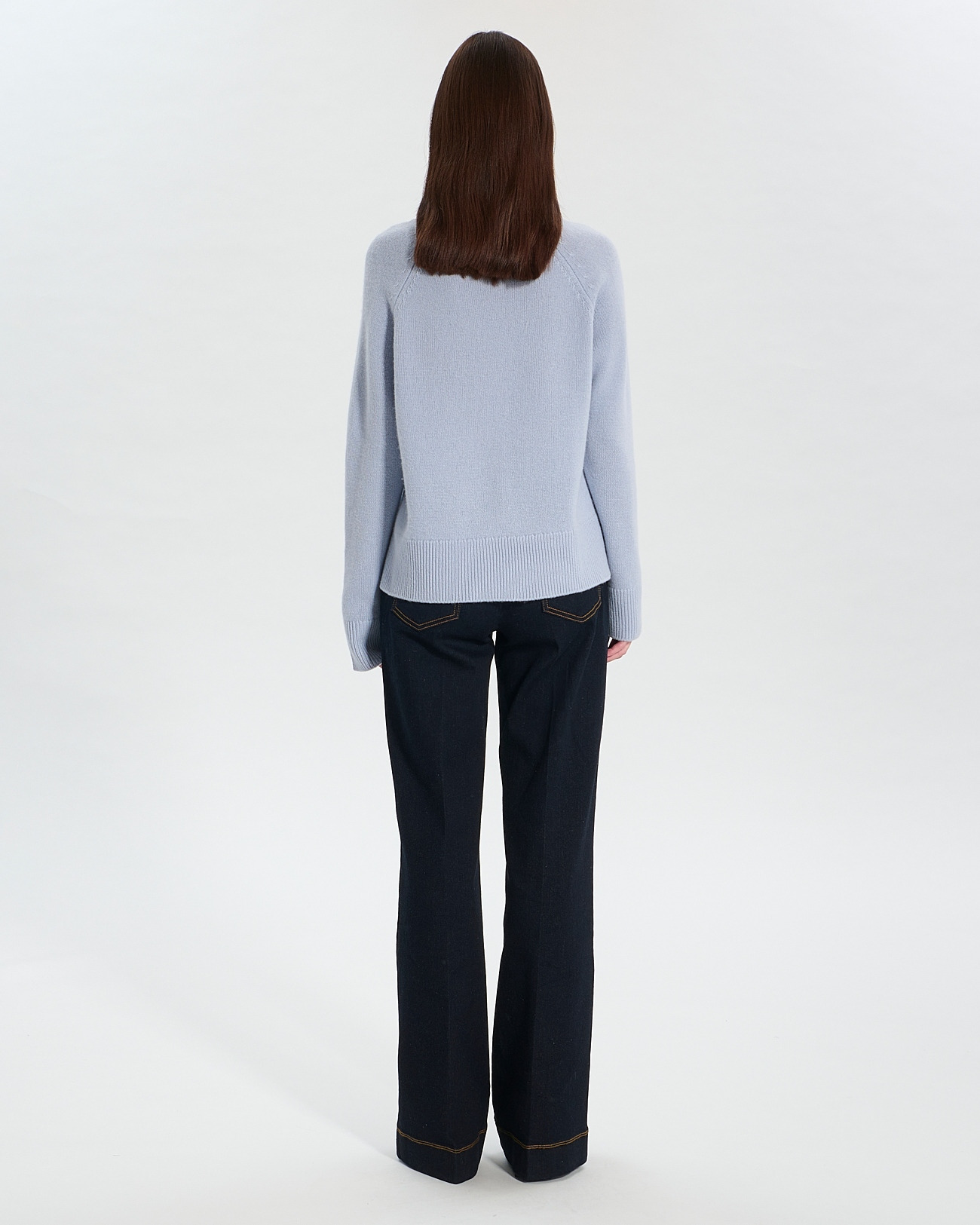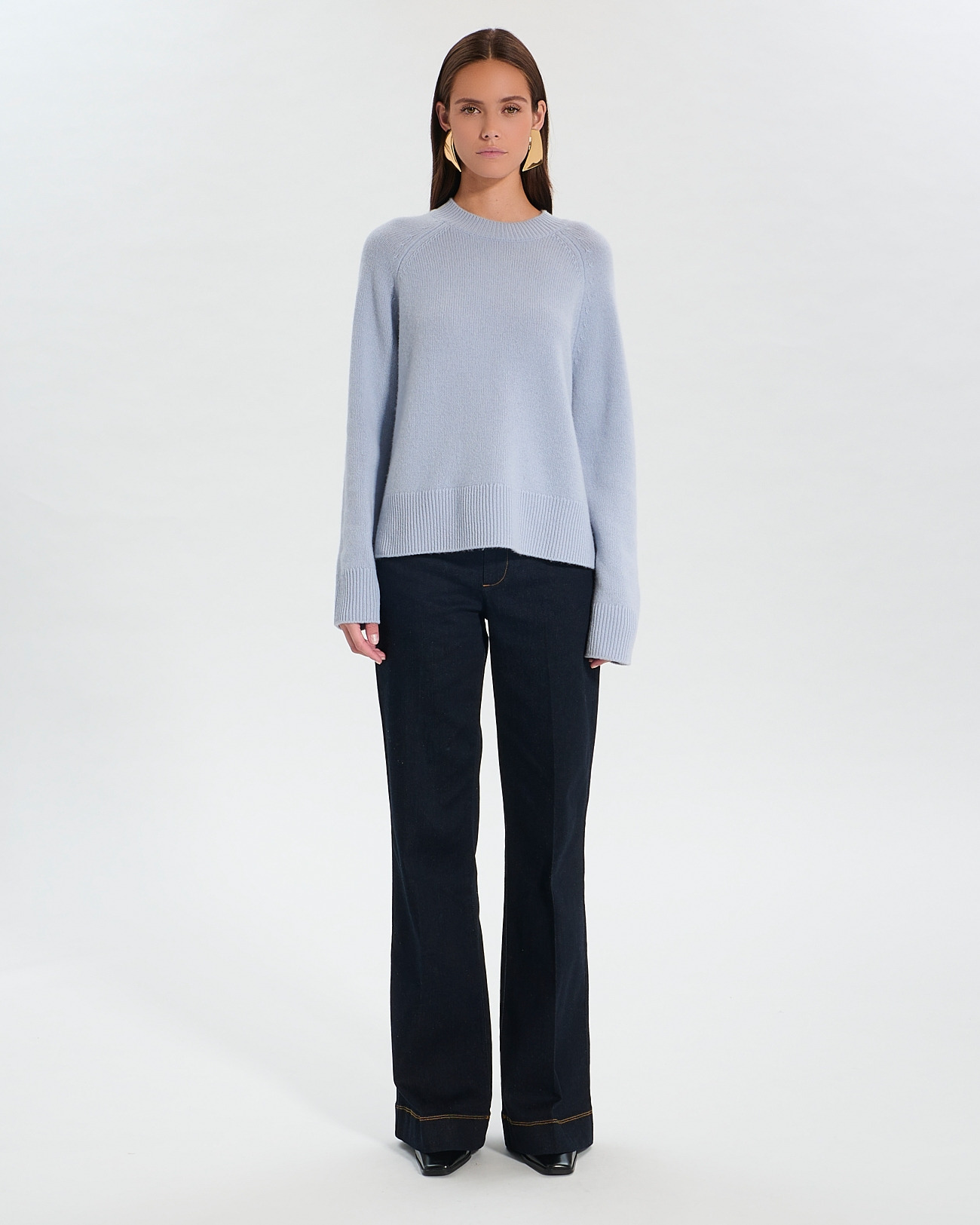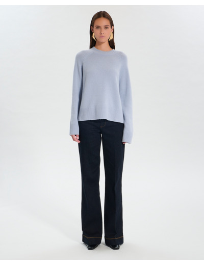 100% laine, lavage à la main recommandé, pas de blanchiment, séchage à plat, repassage maximum 110°C, nettoyage à sec possible. Pull à manches longues, col rond, coloris bleu ciel. Marque Zapa.
