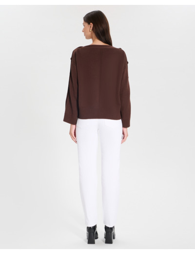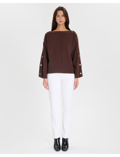 Le pull Nili séduit par son encolure bateau qui révèle délicatement le port de tête, tandis que ses manches longues ornées de boutons apportent une touche raffinée et originale. Conçu pour allier confort et style, il se pose comme la pièce idéale pour composer des looks féminins et sophistiqués, du bureau aux sorties en ville.