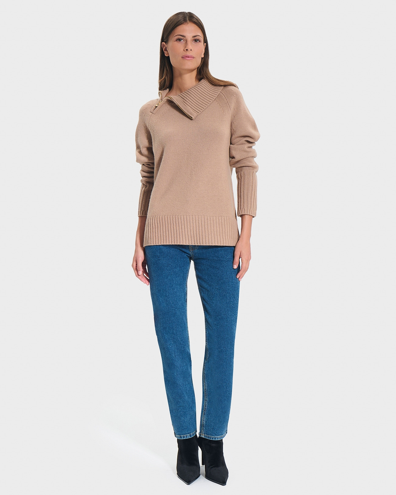 Question ? Quelle est la matière principale du pull Nuala ? Réponse. Il est fabriqué en laine mérinos 100%, reconnue pour sa douceur et sa chaleur. Question ? Comment entretenir ce pull ? Réponse. Il se lave à la main, se sèche à plat et se repasse à basse température, sans blanchiment. Question ? Quelle coupe propose ce pull ? Réponse. Il présente une coupe ample avec un col camionneur asymétrique zippé. Question ? Ce pull convient-il pour un usage quotidien ? Réponse. Oui, son style décontracté et élégant s’adapte à toutes les occasions.