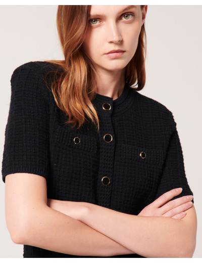 100% laine et coton. Longueur 88 cm. Lavage à la main recommandé. Ne pas blanchir. Séchage à plat. Repassage maximum 110°C. Nettoyage à sec possible. Manches courtes, col arrondi, fermeture à galons, deux poches ouvertes.