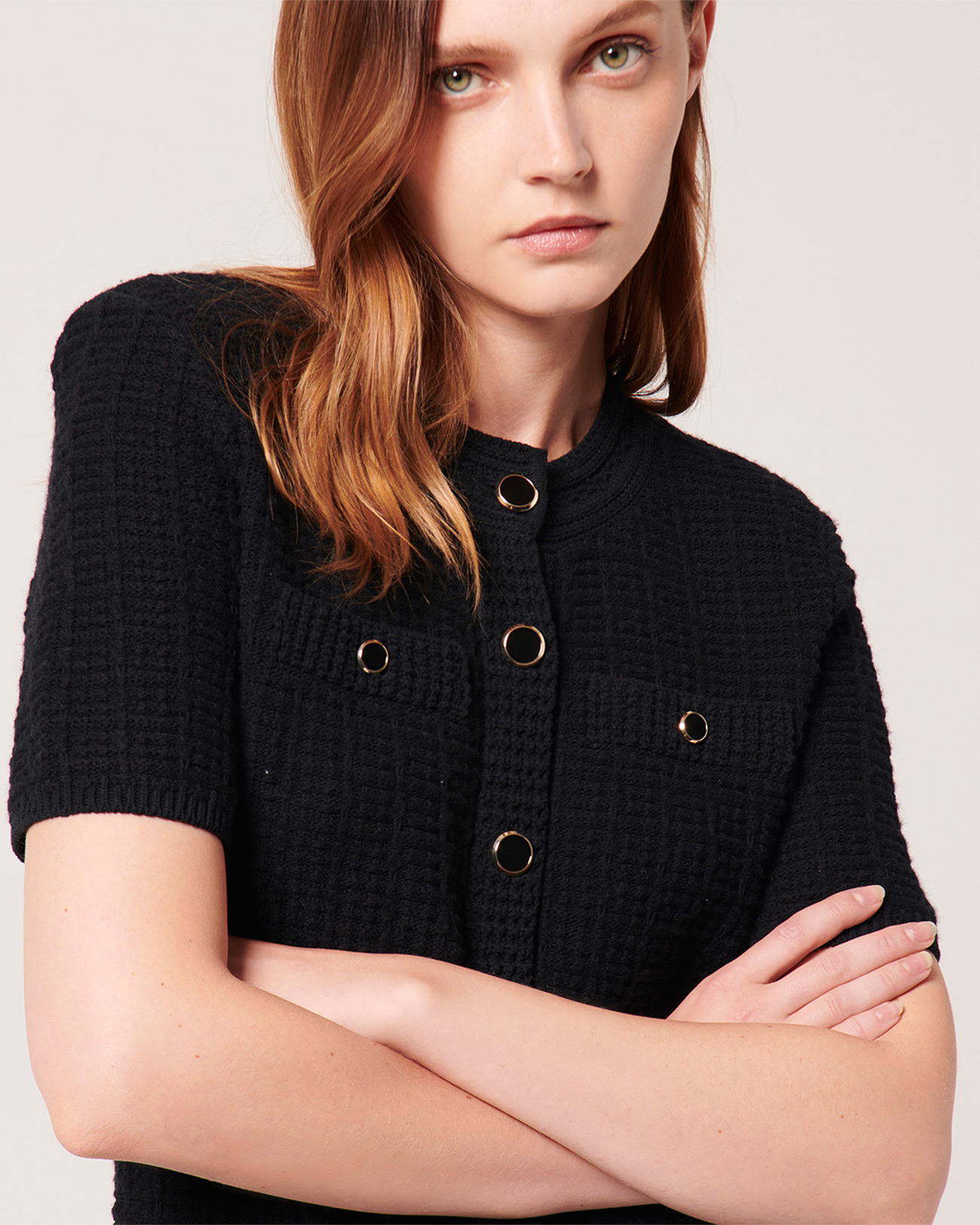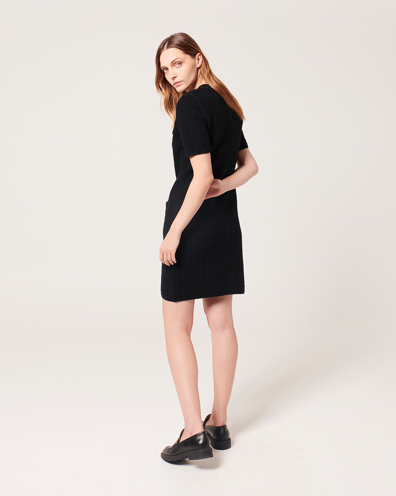 Cette robe façon tweed se distingue par son design raffiné et ses détails pratiques. La fermeture à gros galons souligne la ligne du vêtement tandis que les deux poches ouvertes ajoutent une fonctionnalité discrète. Sa coupe droite et ses manches courtes en font une pièce polyvalente, idéale pour les journées de mi-saison où confort et style se conjuguent parfaitement.