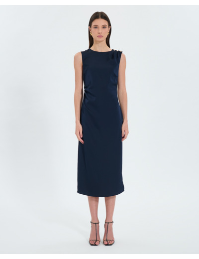 La coupe cintrée met en valeur la silhouette tandis que le drapé délicat sur le côté apporte une touche de sophistication subtile. Son col rond et les détails travaillés aux épaules renforcent son allure distinguée, idéale pour une cérémonie ou un dîner chic. Associez-la à la veste Vickio assortie pour un ensemble harmonieux et parfaitement maîtrisé.