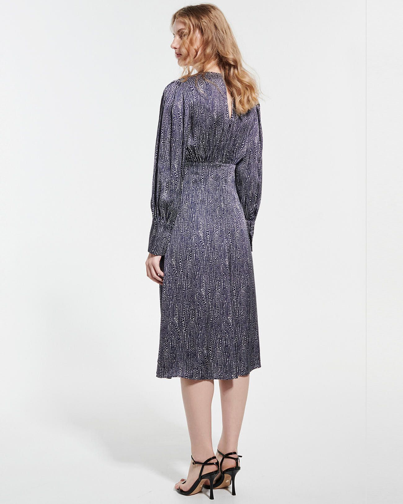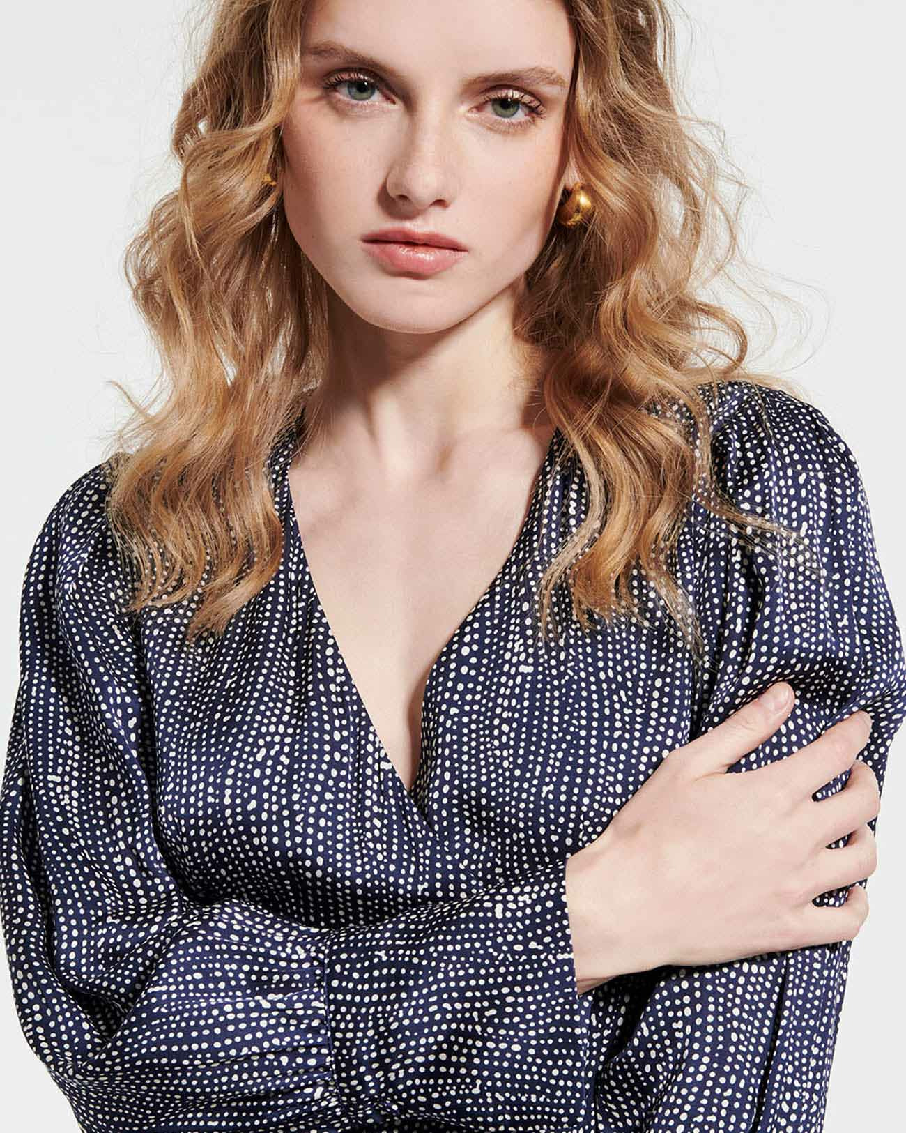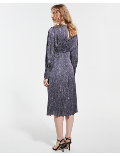 100% viscose, lavage délicat à 30°C recommandé, séchage interdit, repassage interdit, nettoyage à sec délicat. Longueur midi de 108 cm, col V, manches longues, fermeture zippée et ouverture dans le dos, détails boutons sur le devant, doublure polyester. Imprimé marine et blanc.