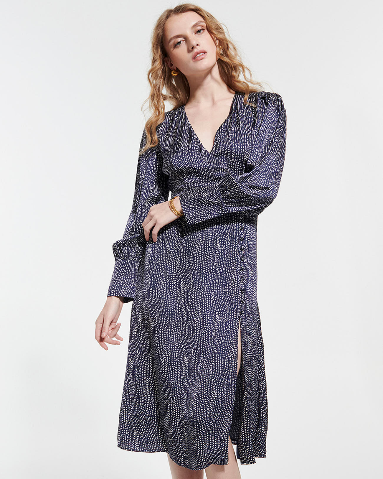 Conçue en viscose fluide, cette robe portefeuille midi épouse délicatement vos formes tout en offrant une liberté de mouvement idéale. Le col en V et les manches longues soulignent votre féminité avec subtilité, tandis que les boutons décoratifs et la fermeture zippée dans le dos ajoutent une finition soignée et pratique. Parfaite pour une soirée ou une journée où vous souhaitez allier style et aisance.