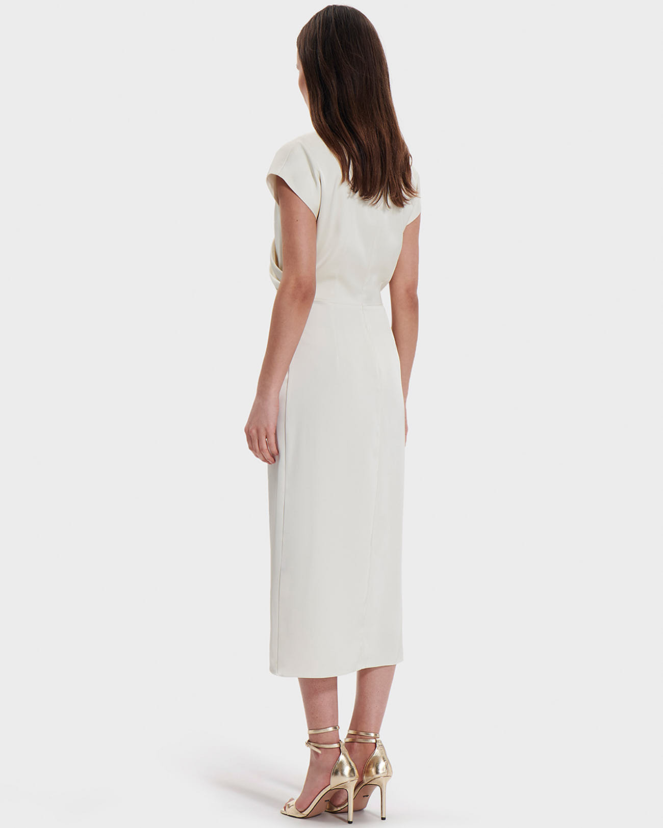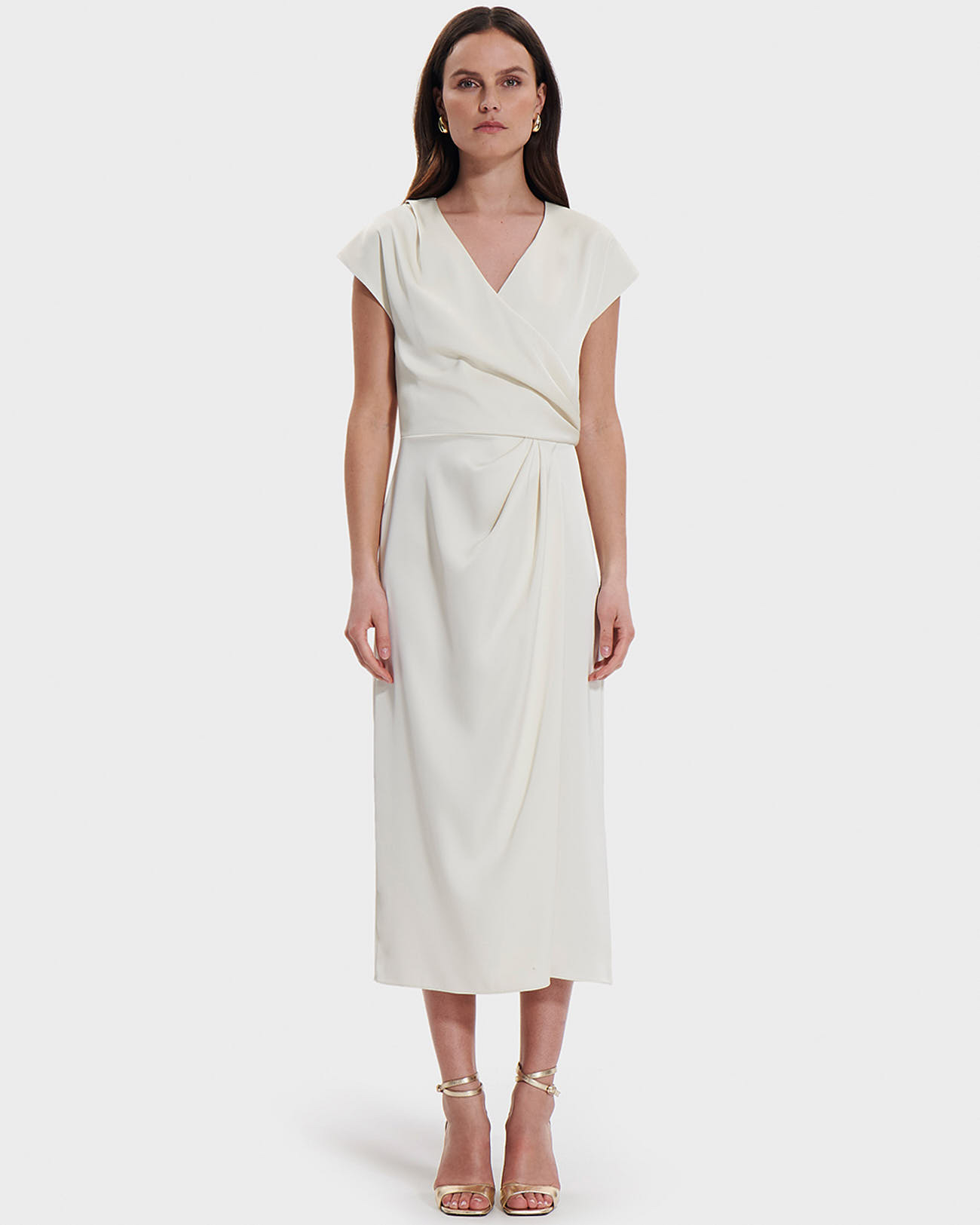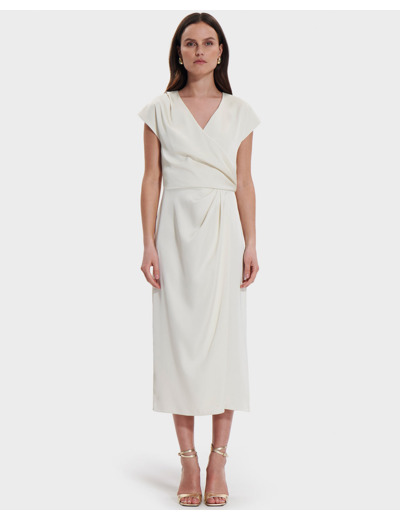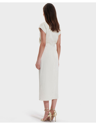 Cette robe longue épouse délicatement la silhouette grâce à son effet drapé et son col en V, révélant une allure féminine et sophistiquée. Les manches courtes apportent une touche de légèreté, tandis que la couleur écru s’adapte à toutes les occasions, du cocktail aux événements formels.