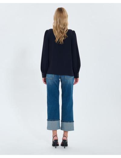 Ce top fluide vous assure une élégance sans effort, parfaite pour composer des looks à la fois raffinés et polyvalents. Son coloris sombre facilite les associations, du jean casual à la jupe habillée, pour un style toujours maîtrisé.