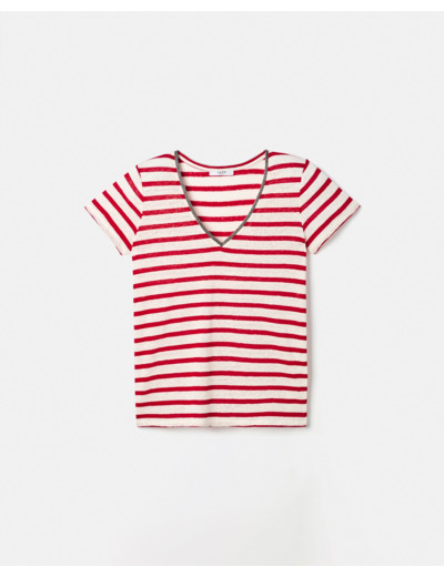 Ce top est idéal pour celles qui recherchent un vêtement à la fois chic et facile à porter, capable de sublimer un jean ou une jupe avec une note colorée et raffinée. Son imprimé à rayures rouges dynamise votre look tout en restant intemporel.