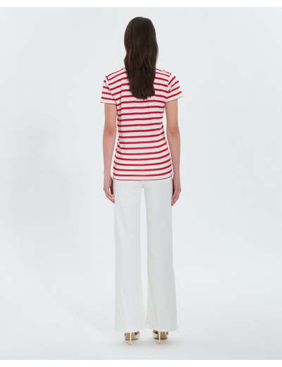 Laissez-vous séduire par l’élégance décontractée du top jersey à rayures rouge, un essentiel pour illuminer vos tenues estivales. Sa coupe fluide et son col V orné de brillants apportent une touche sophistiquée à un imprimé dynamique.