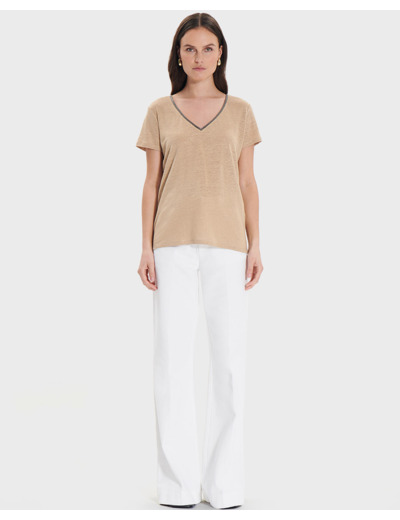100 % lin. Lavage à 30°C délicat. Séchage interdit. Repassage doux. Nettoyage à sec délicat. Top jersey, coupe fluide, col V avec strass, manches courtes, coloris beige.