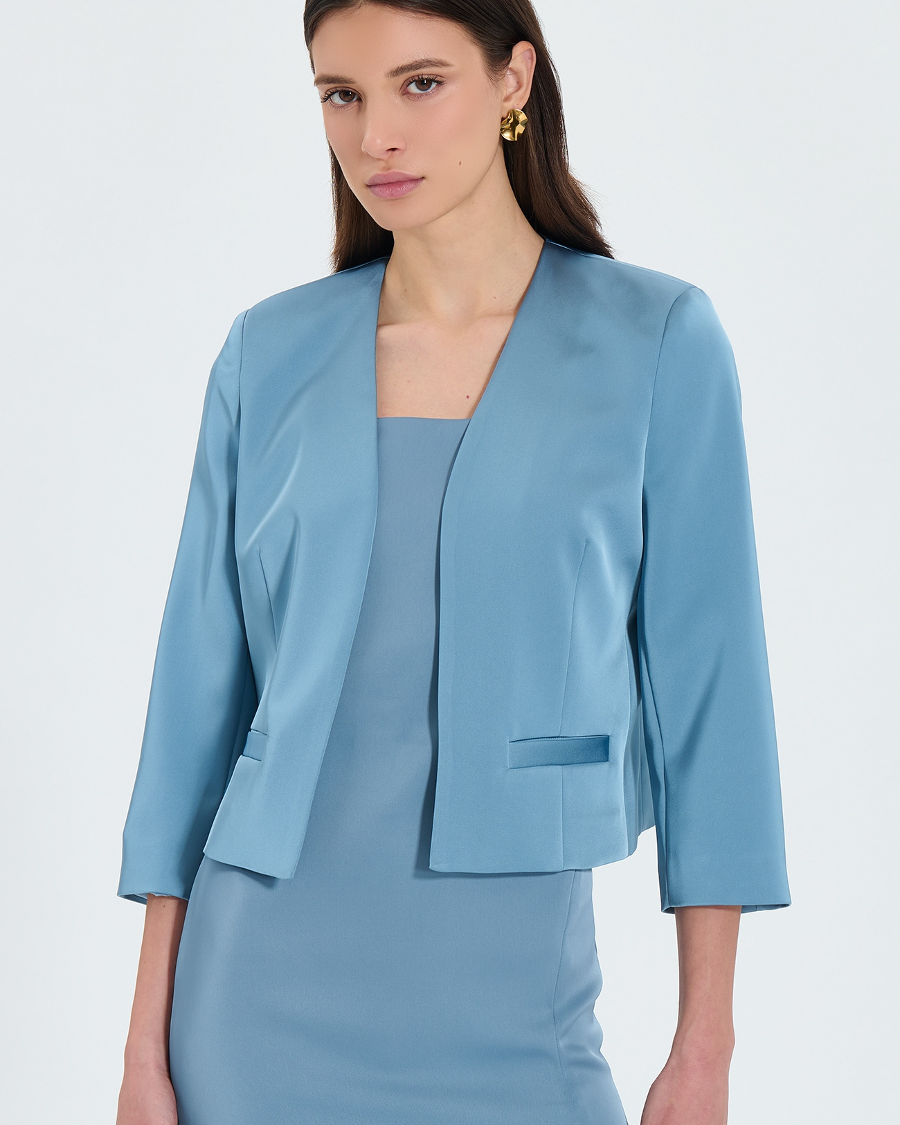 Sublimez votre silhouette avec la veste courte satinée bleue VICKIO, une pièce élégante qui allie modernité et féminité. Sa coupe structurée et son tissu brillant apportent une touche sophistiquée à toutes vos tenues.
