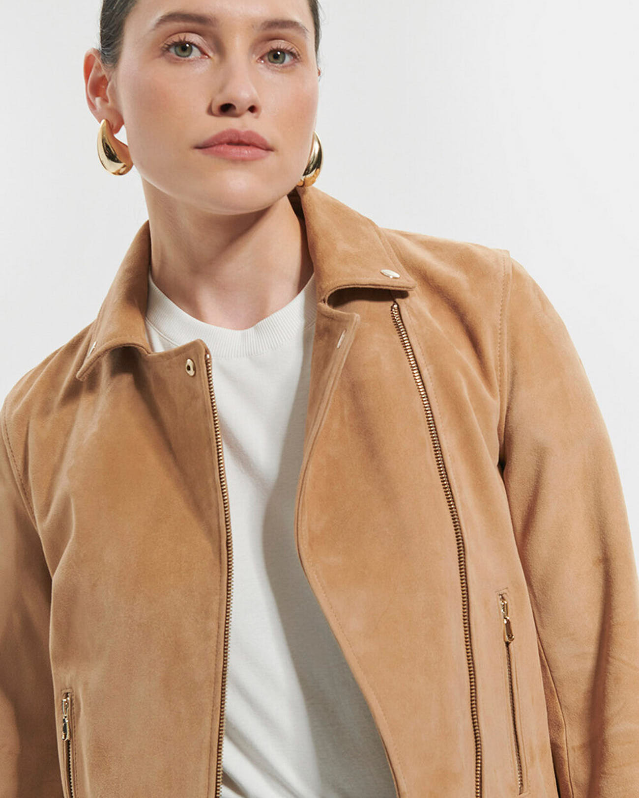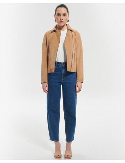 Perfecto droit en suède, fermeture par zip asymétrique, col à pression, poches et poignets zippés, soufflets et découpes arrondies dans le dos. Longueur : 58 cm.