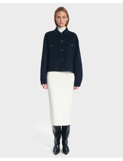 Cette veste courte à la coupe ample s’inspire de la surchemise pour un rendu moderne et confortable. Son col à revers structuré et ses manches longues équilibrent parfaitement la silhouette, tandis que les deux poches à rabat ajoutent une touche pratique et esthétique. Le coloris nocturne, sobre et chic, s’accorde facilement avec toutes vos tenues.