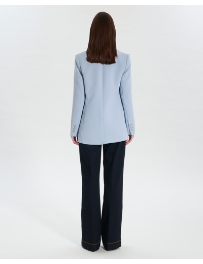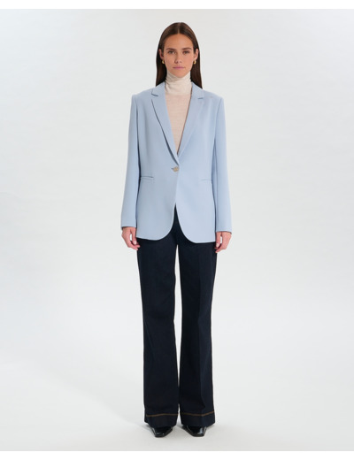 100% polyester, lavage à la main recommandé, pas de blanchissage, séchage à l’air libre, repassage doux à 110°C, nettoyage à sec possible. Simple boutonnage, col tailleur, poches passepoilées, manches longues, coloris bleu ciel.